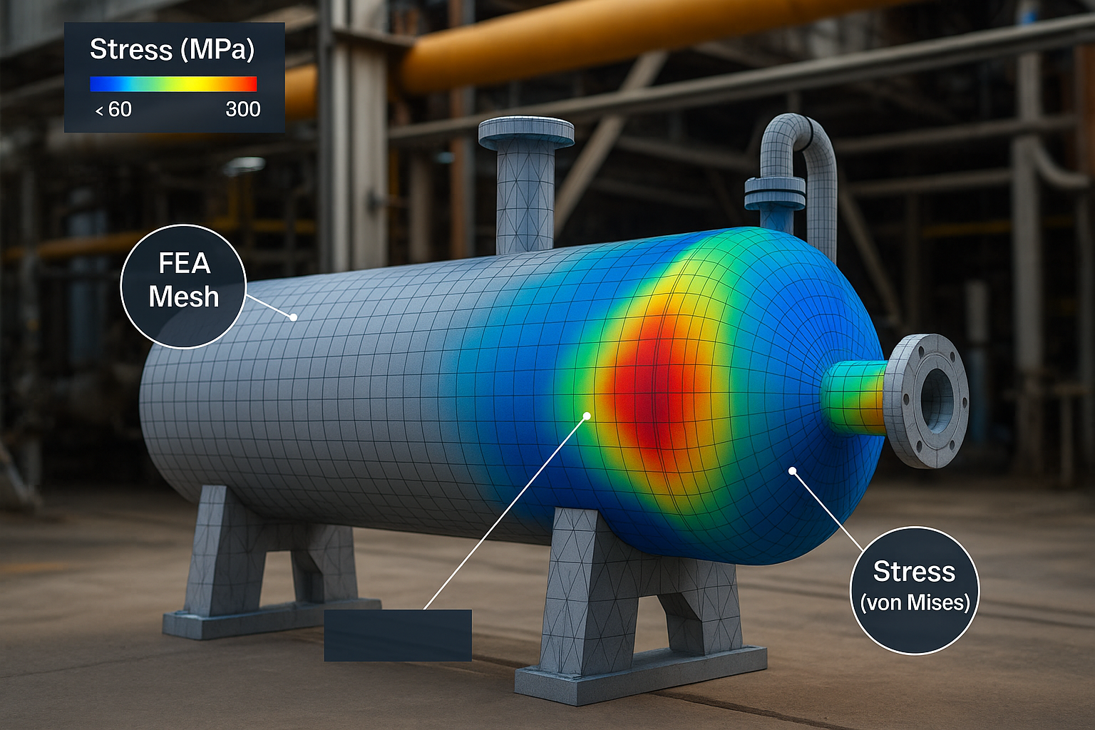 • Vasos de pressão e sistemas pressurizados: verificação conforme ASME VIII, análises de espessura mínima, bocal/reforço, flambagem local, ciclos térmicos e fadiga.
